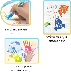 The set includes water pens, foam stamps, and a booklet with ideas to inspire new pictures and patterns. Thanks to its larger size, the mat is ideal for shared creativity for siblings or parents with children.