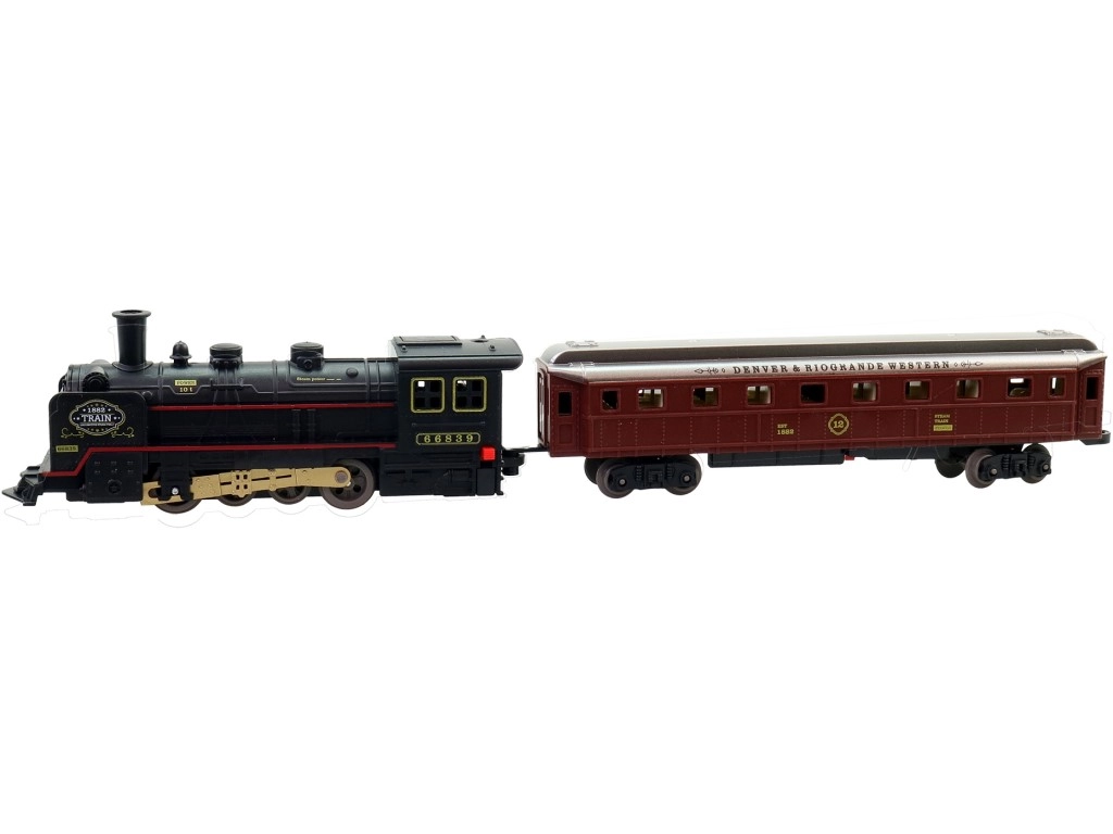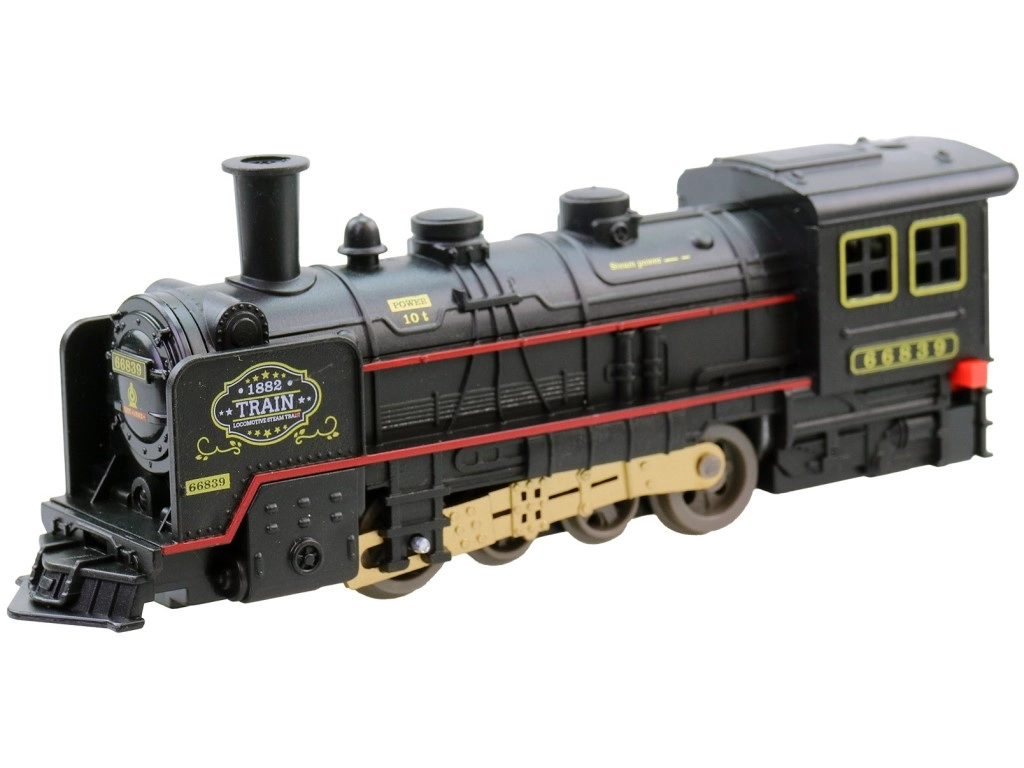 A black locomotive with red and gold accents, a smokestack, and striking wheels adds the atmosphere of a real railway to every ride.
