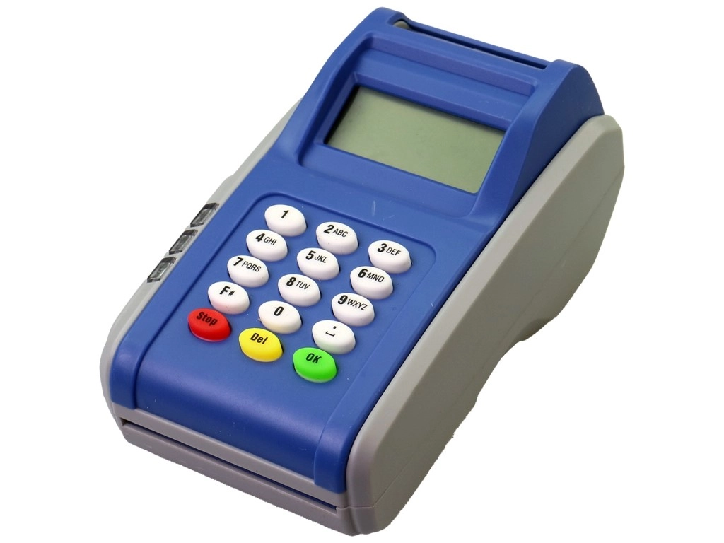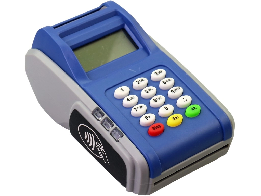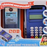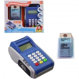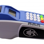 A small display, numeric keypad, and colorful function buttons teach kids to enter amounts and confirm payments in a playful way.
