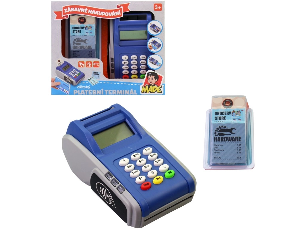 The kids’ payment terminal turns every pretend shop game into a realistic experience. Little cashiers can enter amounts using the numeric keypad, “tap” cards thanks to the contactless feature, and practice communication and counting. The compact 17 × 14 × 6.5 cm size fits into a backpack or kids’ bag, making it perfect for home, trips, and preschool.
