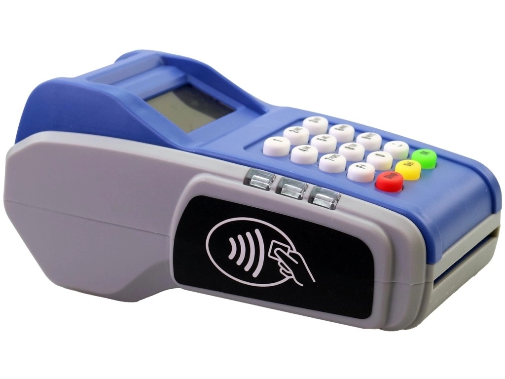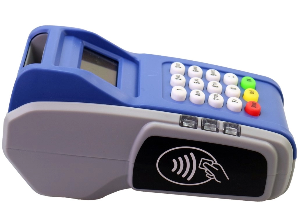 The side contactless payment symbol supports pretend tapping of a card and builds understanding of modern payments.