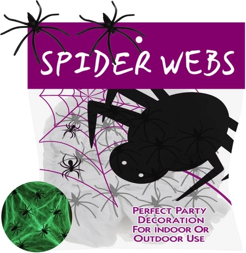 A stylish Halloween decoration that creates a mysterious atmosphere. After exposure to light, the web glows greenish in the dark and looks remarkably realistic. Includes 20 spiders to amplify the fear factor. Perfect for Halloween, themed parties, set design, and photoshoots.