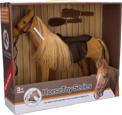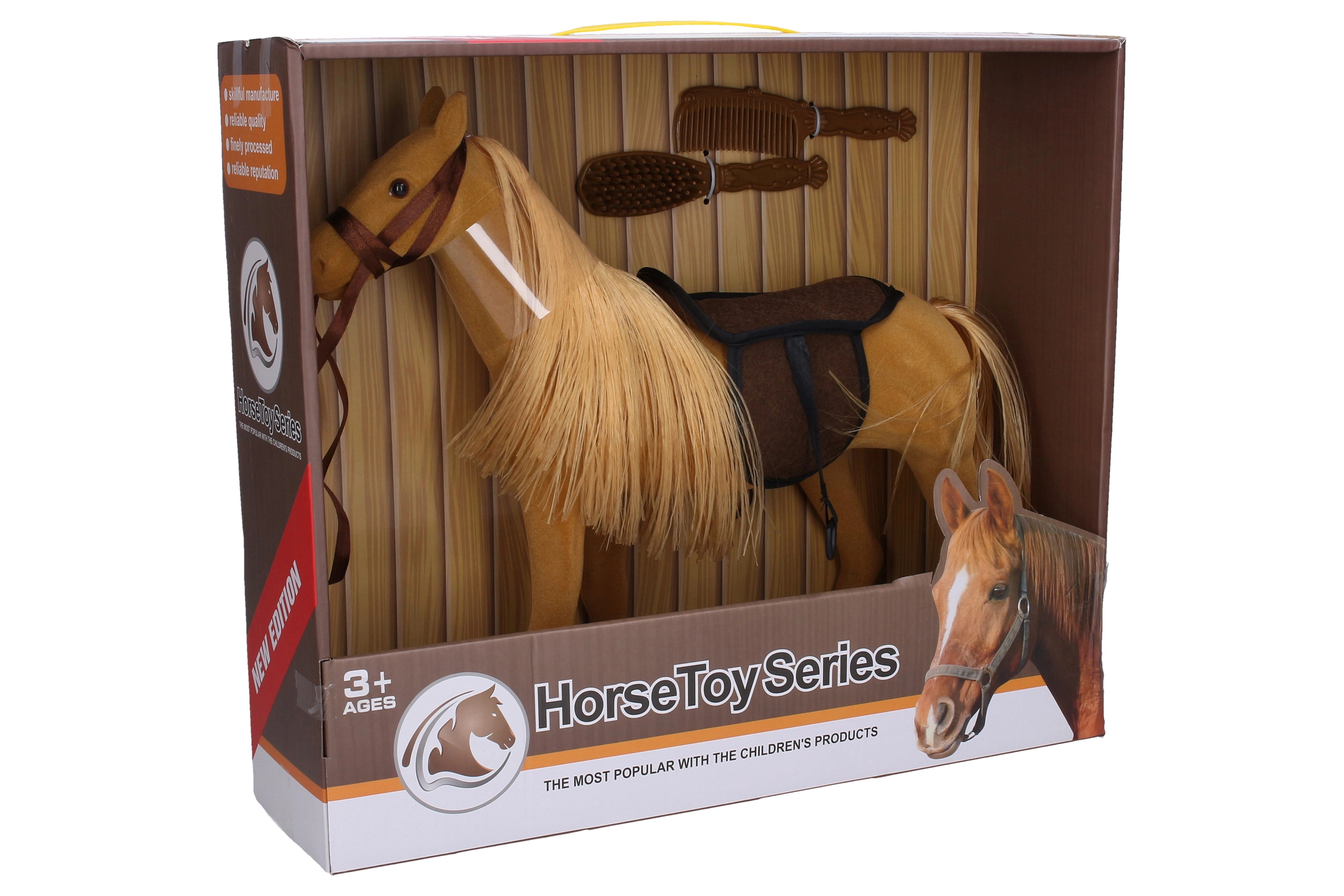This soft and pleasant plush horse is ideal for cuddling and imaginative play. With the included saddle and two brushes, children can try caring for a horse, develop fine motor skills, and invent their own stories.