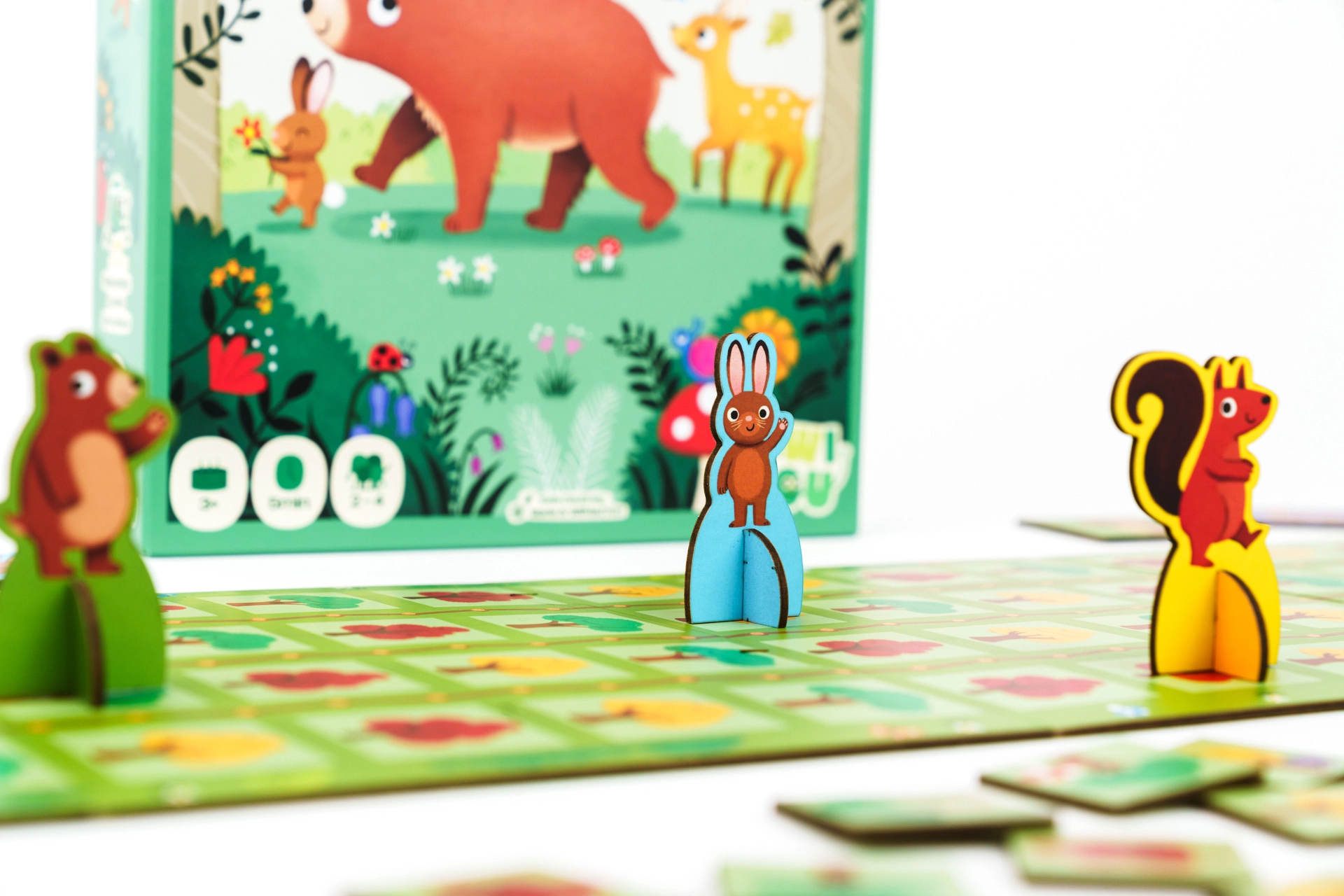 Forest Races is a brisk children’s board game where cute animals try to be the first to dash through the forest and reach the finish line. Instead of classic dice rolling, players simultaneously draw tokens from a bag—these determine which space everyone moves to. Occasionally, a food token appears and the racers can’t resist a snack, pleasantly slowing the race and adding a surprise twist.