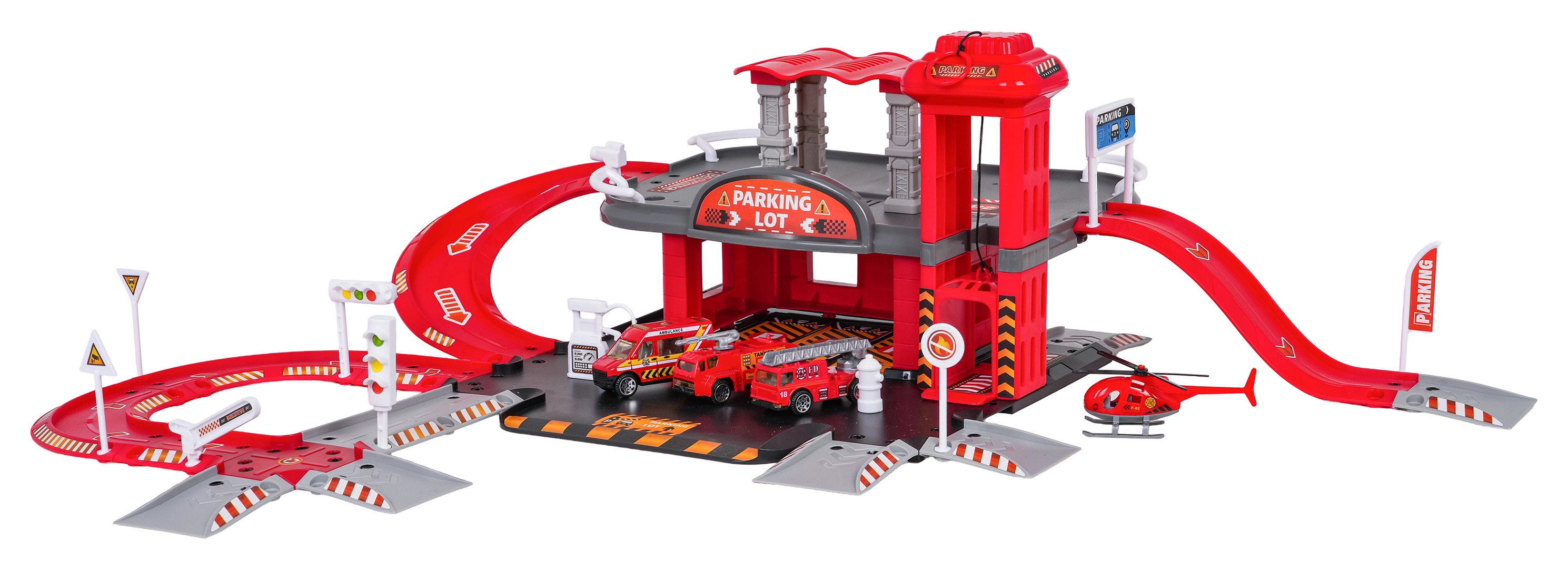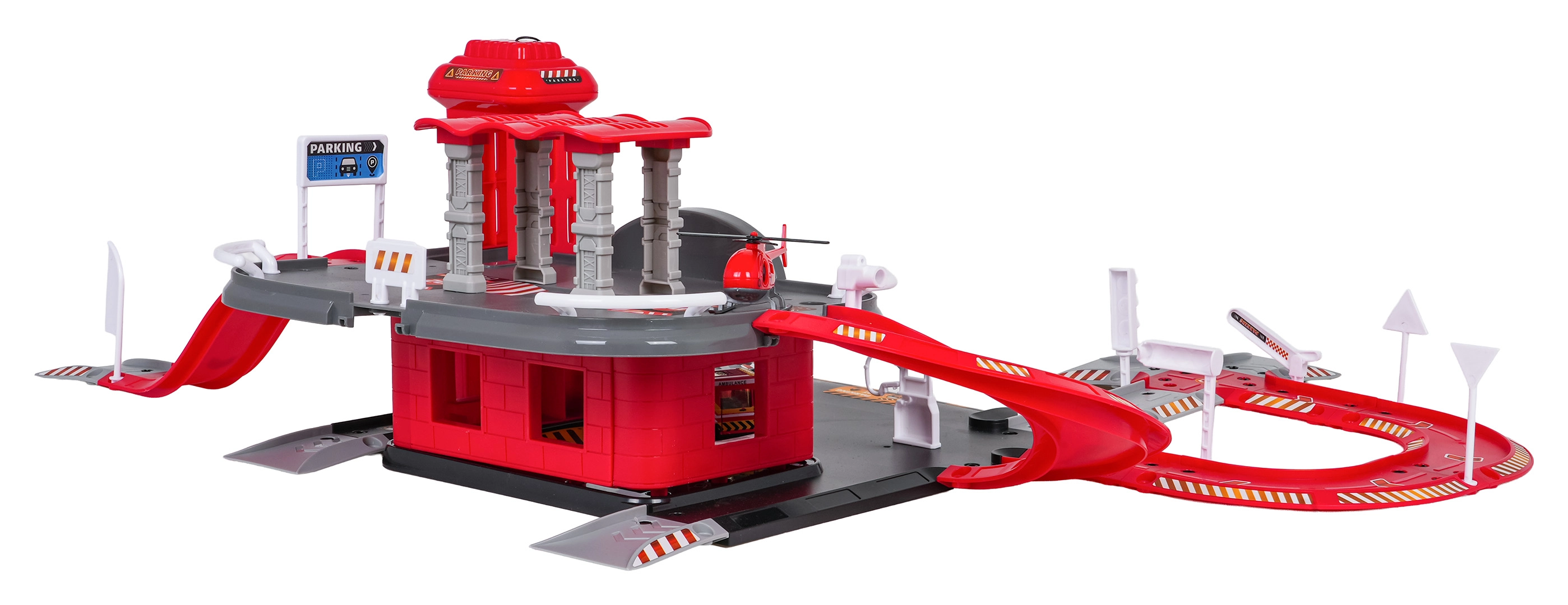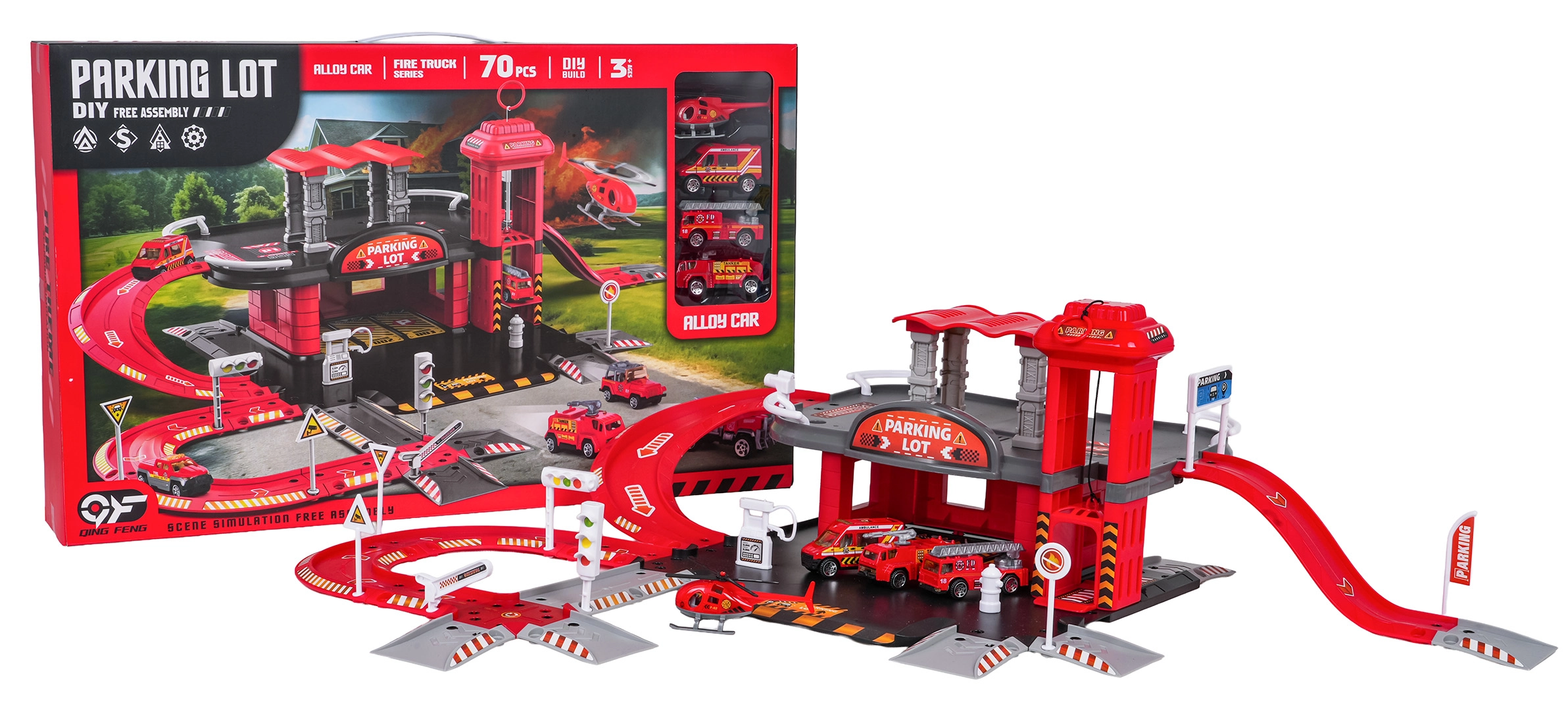 This finely crafted fire station set combines fun with skill development. Kids can refuel at the gas station, drive along the road, lift the vehicle to the upper level with the manual elevator, and park in designated spaces. From the top level, vehicles return by elevator or speed down the spiral ramp.