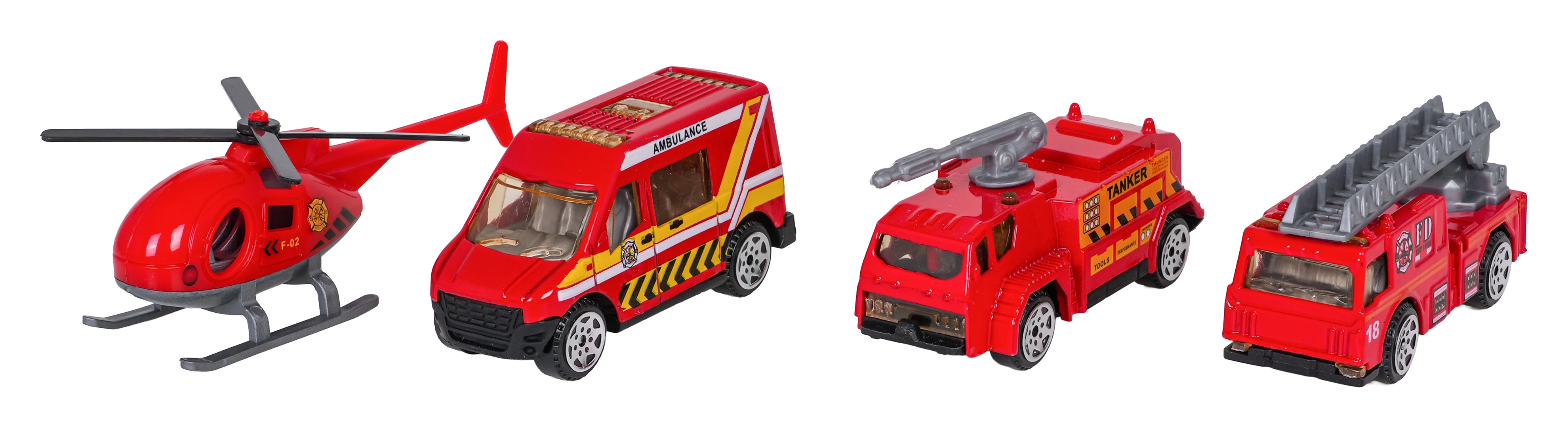 Three durable die-cast vehicles with moving parts and a detailed helicopter expand play possibilities and enhance realistic action.