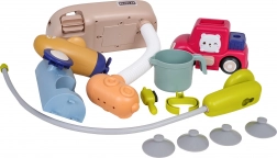 A little car, cup, and multiple water elements encourage creative play, pouring, spraying, and fine motor development.