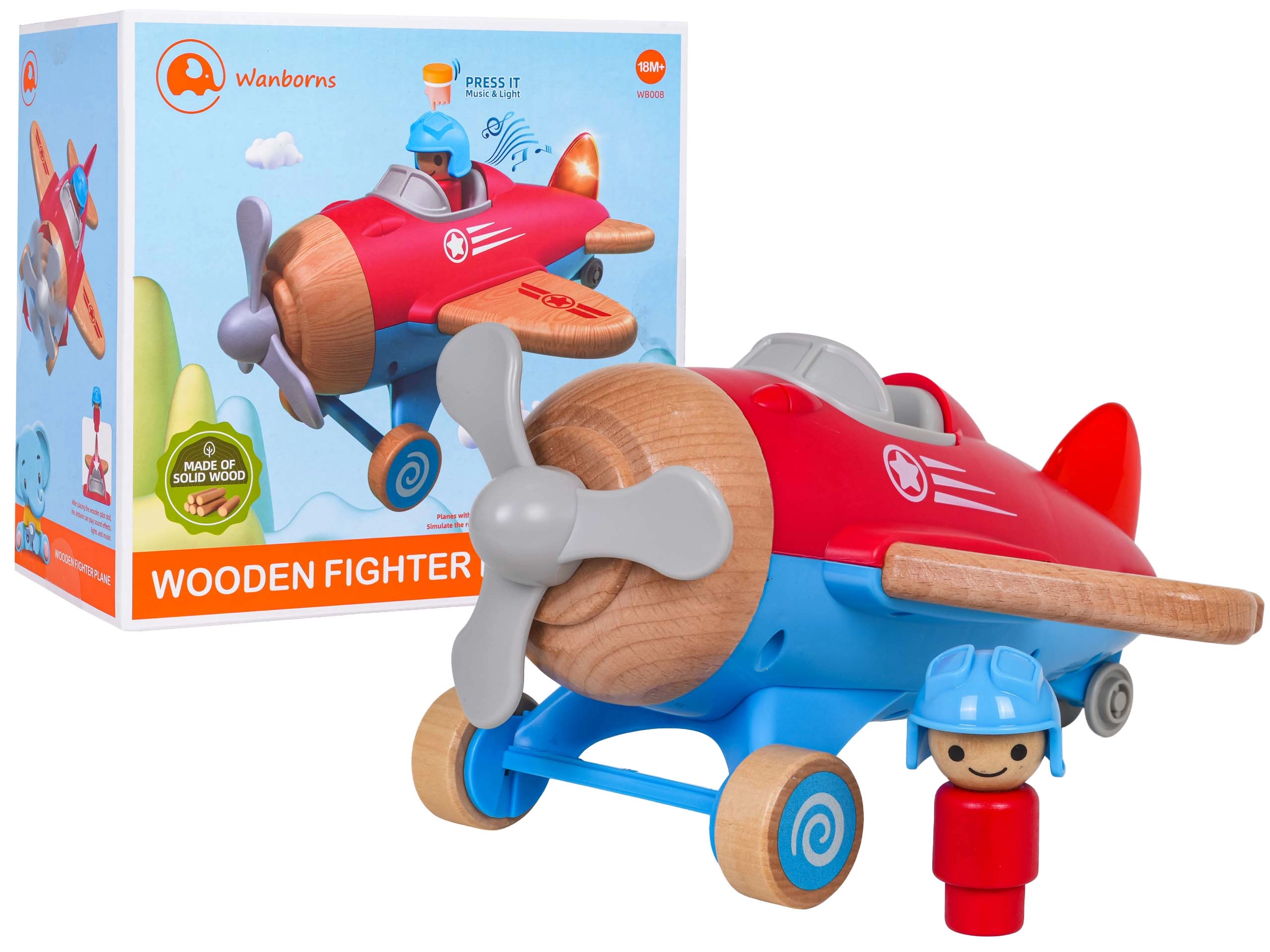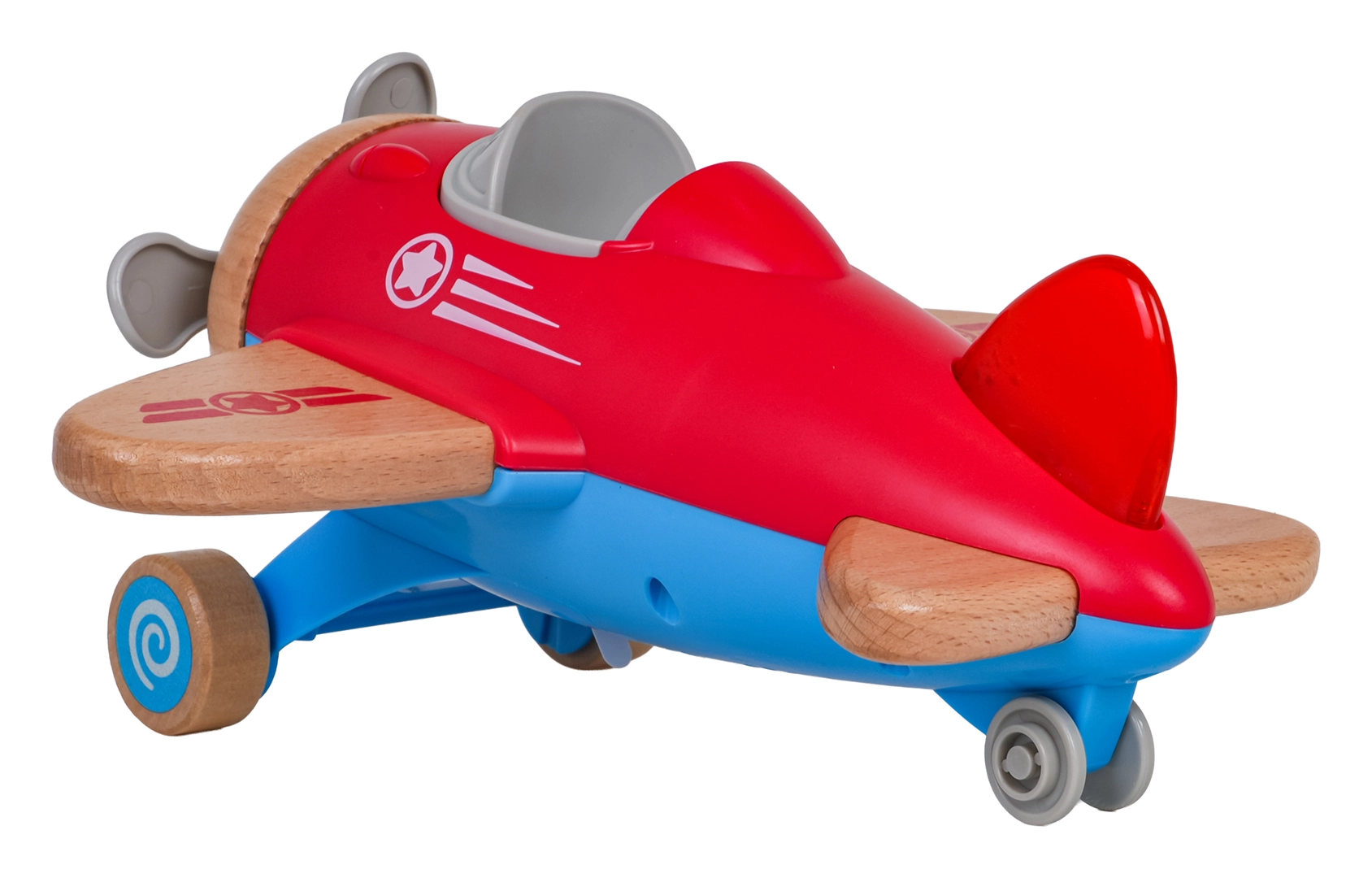 A colorful wooden airplane for little ones from 18 months offers light and sound effects, a spinning propeller, and rolling wheels. The combination of wood and high-quality plastic ensures durability and safe play with no sharp edges. Press the pilot figure to play melodies and airplane takeoff sounds and light up the rear wing.