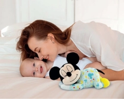 This soft MICKEY MOUSE plush is an ideal companion for falling asleep and quiet moments during the day. It combines soothing light effects with melodies and sounds that mimic a baby’s natural environment. The color light with changing intensity (chromotherapy) helps settle, reduce tension, and create a pleasant atmosphere.