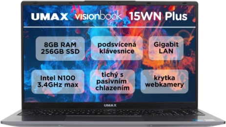 UMAX VisionBook 15WN Plus combines an attractive slim design with practical features for everyday use. The efficient and responsive Intel Alder Lake-N100 ensures smooth operation of office apps, web browsing, streaming, and light multimedia. The 15.6" IPS Full HD display with thin bezels offers sharp images and wide viewing angles, while the large touchpad and backlit keyboard with CZ/SK layout and numeric section make typing pleasant even in the evening.