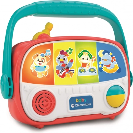 The CLEMENTONI Talking Kids Radio is a fun and educational radio-shaped toy with backlighting, designed especially for small hands. Four large buttons trigger melodies and animal sounds — dog (pop), rooster (rock), cat (rap), and bird (relax) — which develop auditory perception and natural curiosity.