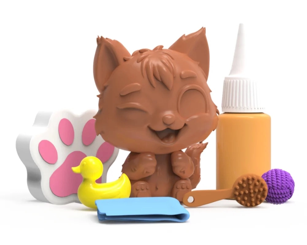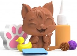 1× Karmelek kitten figurine, 1× tube with “mud,” 5× accessories (sponge, brush, duck, ball of yarn, towel)