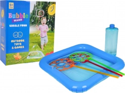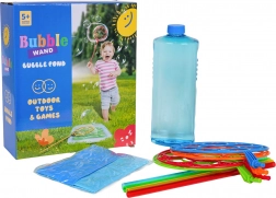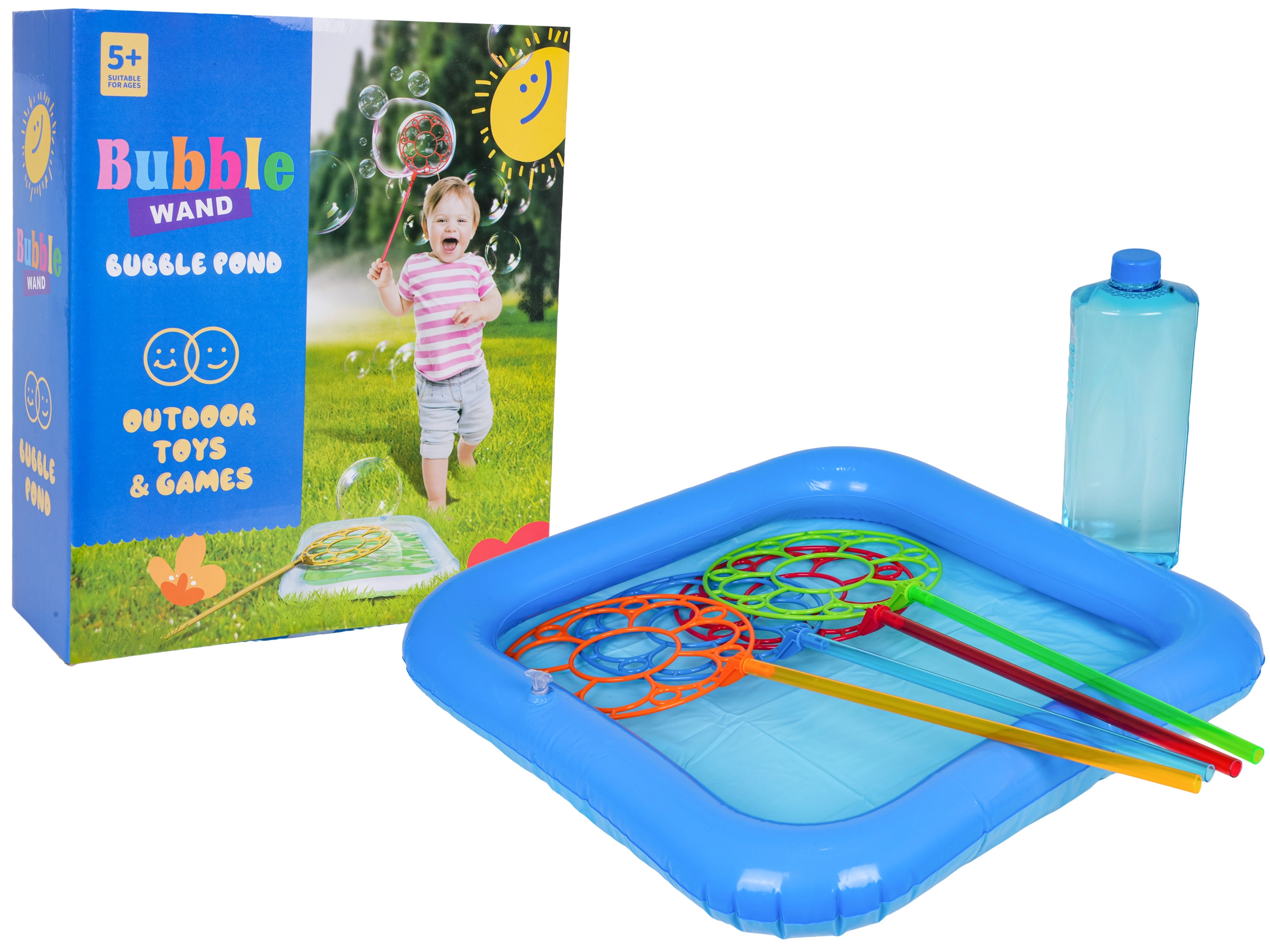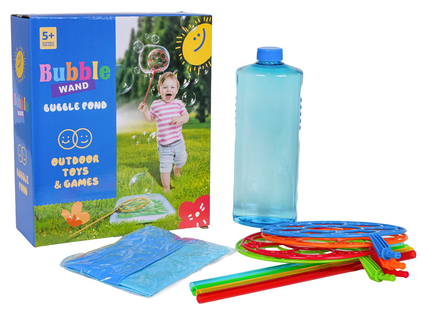 Enjoy outdoor fun with the giant soap bubble set for kids aged 5 and up. The set is easy to use and includes 4 colorful rings, a bottle of solution, and an inflatable tray for the liquid. A great game for the garden, park, and vacations.