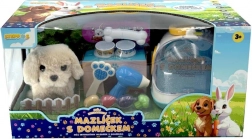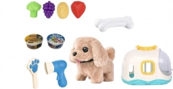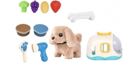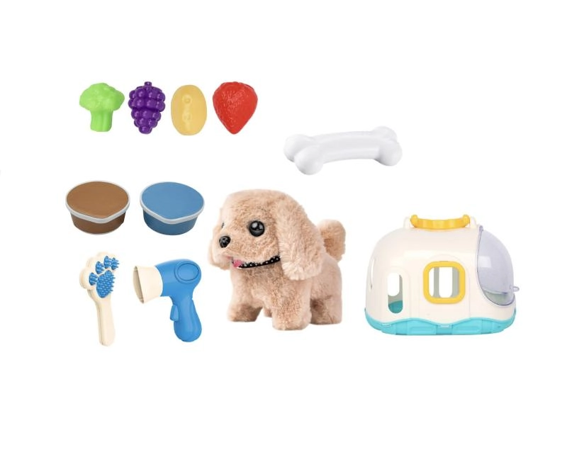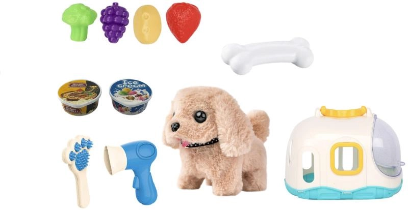 The practical little house serves as a cozy base and a portable case, so kids can take the puppy anywhere. The set also includes care accessories—a comb and a hair dryer—and plastic treats shaped like fruit and vegetables for pretend feeding.