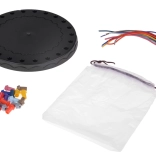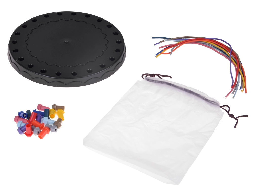 Circular board, a set of pegs and strings, plus a practical pouch for transport—perfect for trips and school.