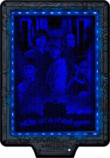 This one-of-a-kind puzzle brings the cinematic vibe of STRANGER THINGS into your home. Thanks to the integrated electronic module and RGB LED strip, the image transforms when illuminated—each LED color reveals a different layer of the Hunt for the Demogorgon scene. Under normal lighting, you’ll see a composition overlaying three color levels; in the dark, each hue renders new details.