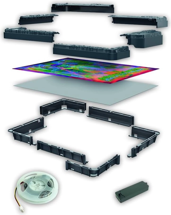 Puzzle, rigid backing board, glue, mountable plastic frame, electronic module, RGB LED strip, reference poster, instructions