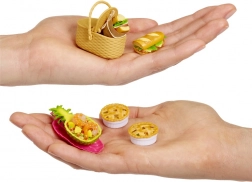 Set for making a mini meal or drink, miniature table, collector leaflet; depending on the variant may include a bottle with gel/resin, a bottle with glue, and a container with sand