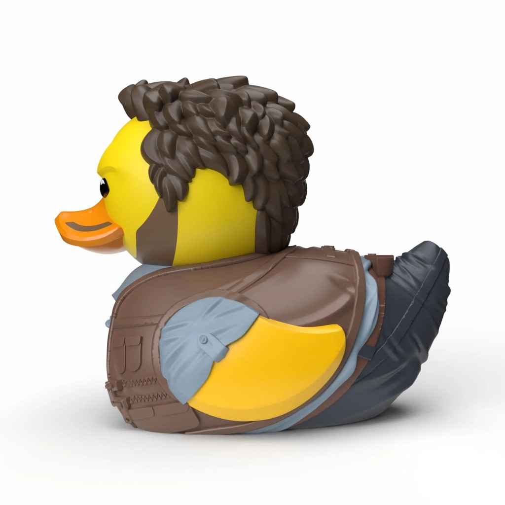 Intricate details of the hair, vest, and outfit faithfully capture the character of Owen Grady in duck form.