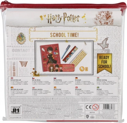 A stylish school set with a HARRY POTTER theme in a transparent plastic case includes everything a little (pre)schooler needs: a pencil case, ruler, pencil, 4 colored pencils, eraser, sharpener, pen, and a notepad. Ideal for writing, drawing, and taking notes at school or on the go.