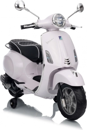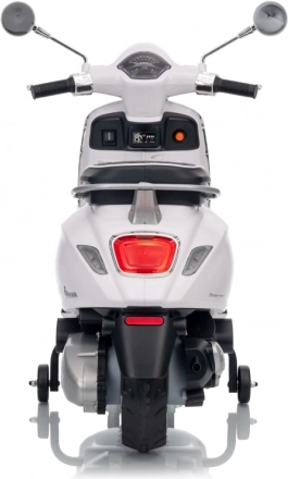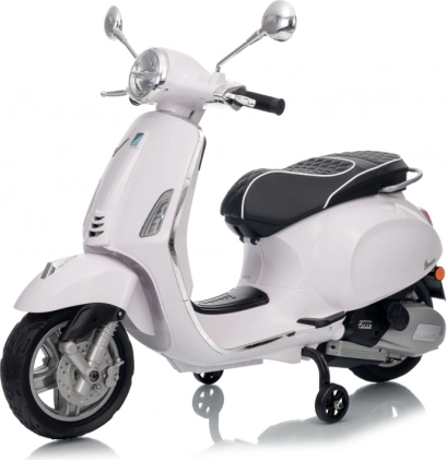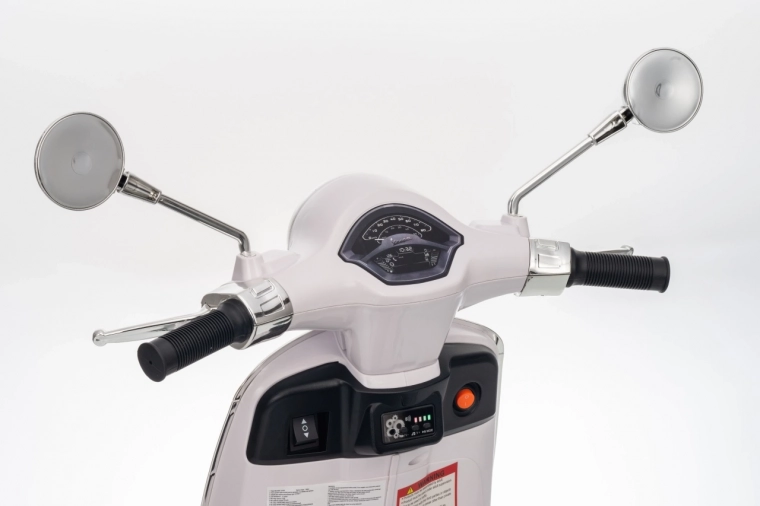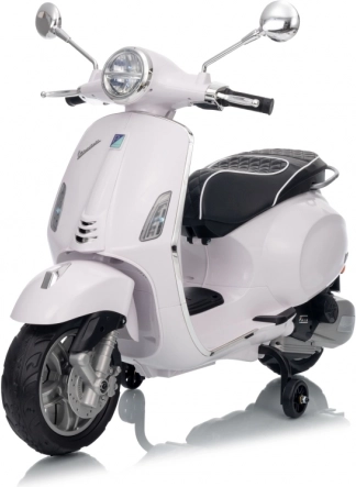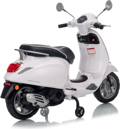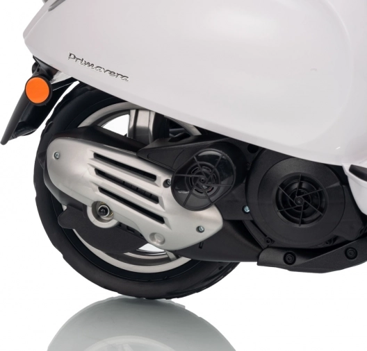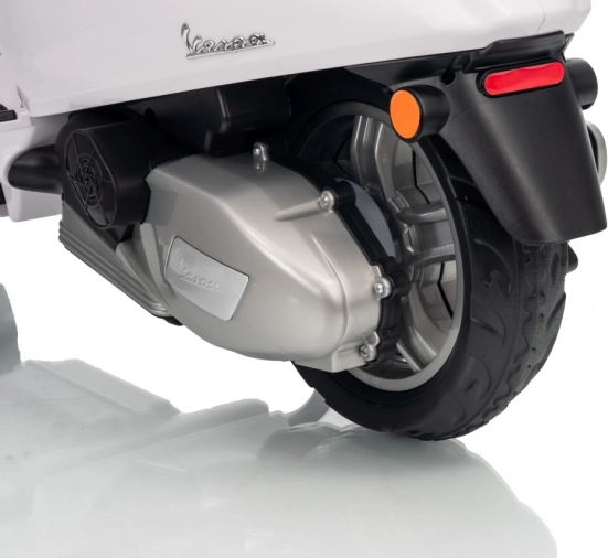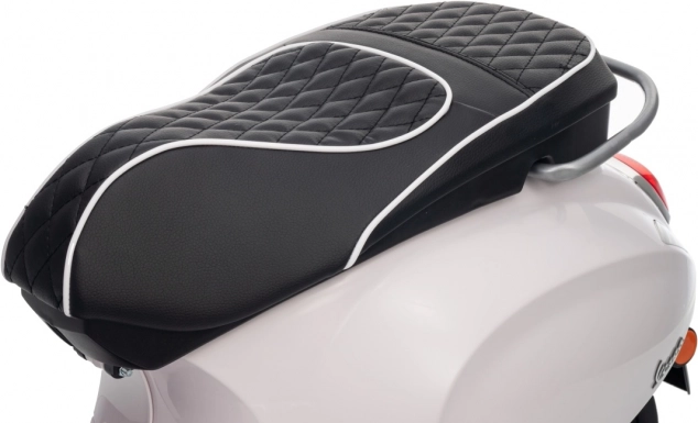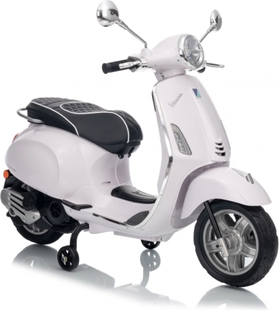 The stylish kids' electric scooter VESPA ROMA in white impresses with its realistic design, comfortable eco-leather seat, and quiet EVA wheels. Thanks to two 2×35 W motors, a 12 V 7 Ah battery, smooth start, and front and rear LED lights, it’s ideal for safe and fun riding. It also features Bluetooth, MP3/AUX, preinstalled melodies, and a battery level indicator.