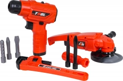 - bag, cordless drill/screwdriver, angle grinder, caliper, adjustable wrench, ring and open-end wrench, pliers, knife, screwdriver with holder and bits, protective goggles, 7× part for screwing, 10× nut, 10× screw