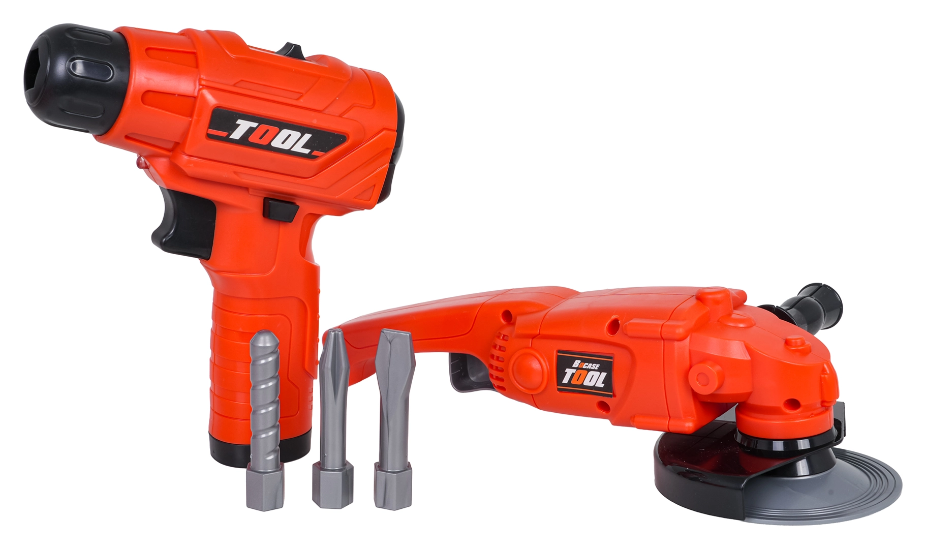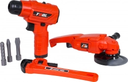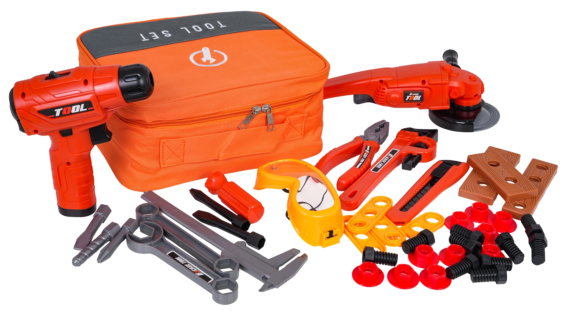 Well-equipped children's tool set with a practical bag offers 42 pieces for creative building and learning through play. Includes a battery-powered drill/screwdriver with light and sound effects, an angle grinder with a manually rotating disc, wrenches, pliers, protective goggles, screws, nuts, and interchangeable bits. Made of high-quality, child-safe plastic for ages 3 and up.