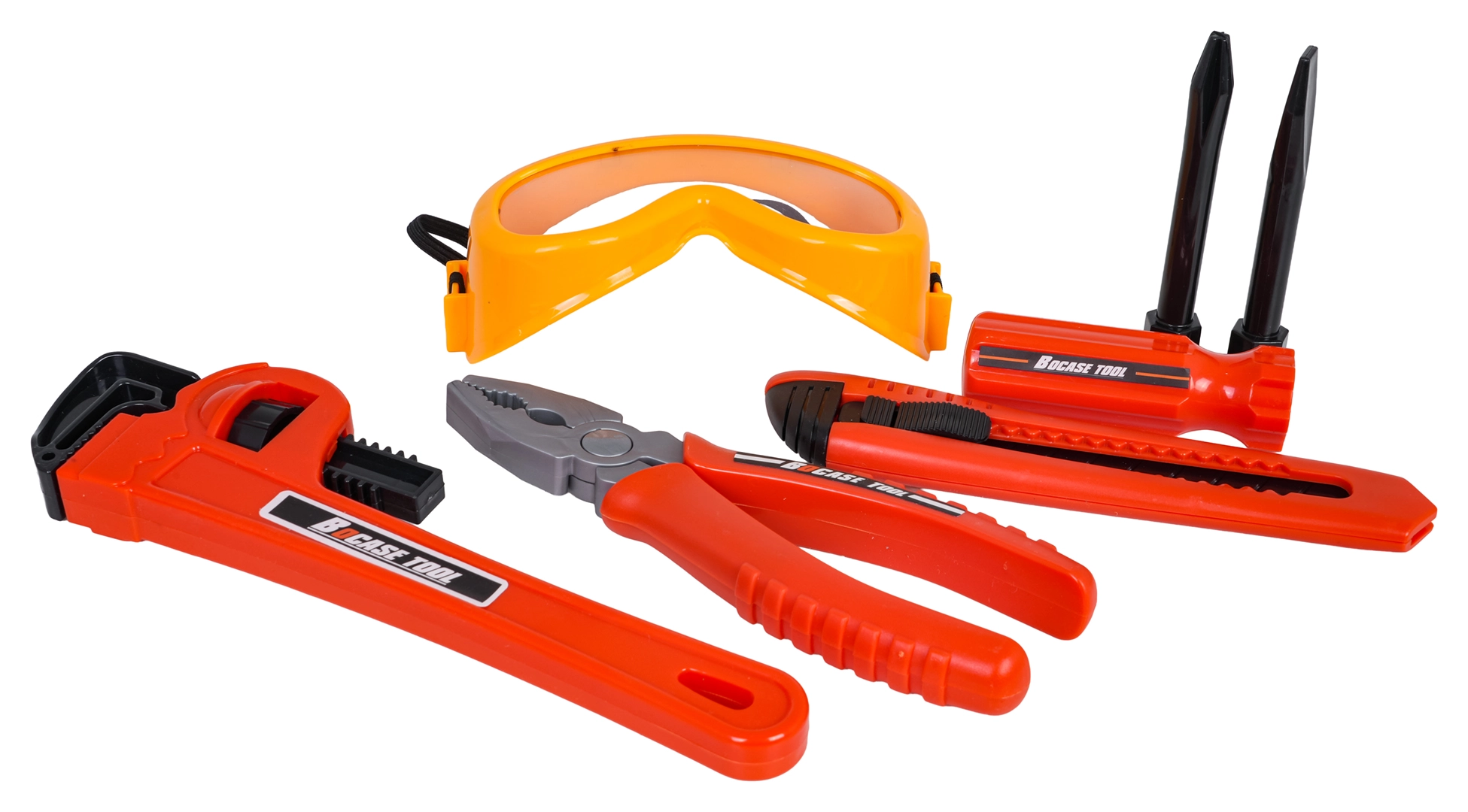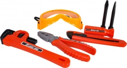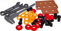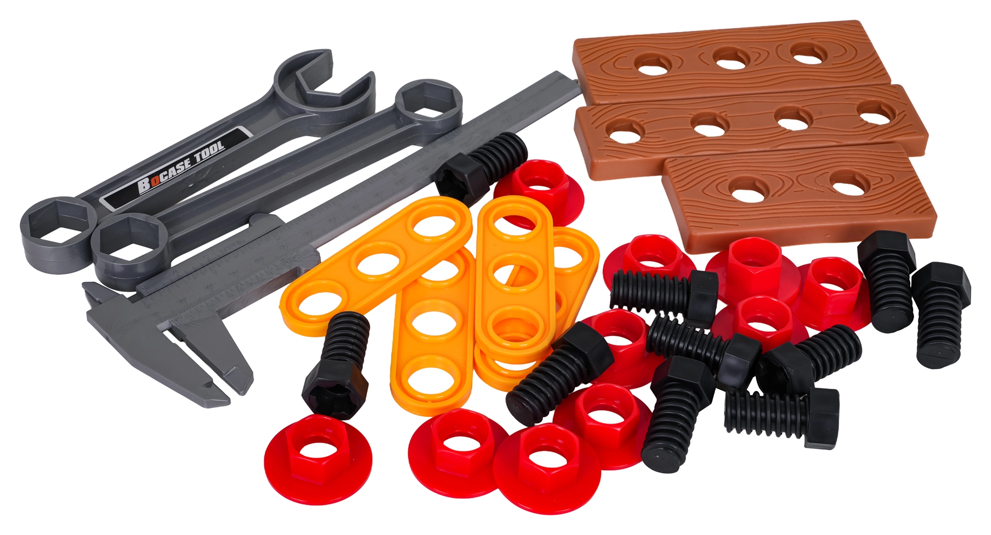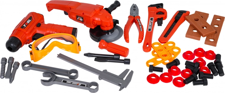 Wrenches, pliers, knife, screwdriver with attachments, angle grinder, caliper, protective goggles, screws, nuts, and connecting parts help develop fine motor skills.