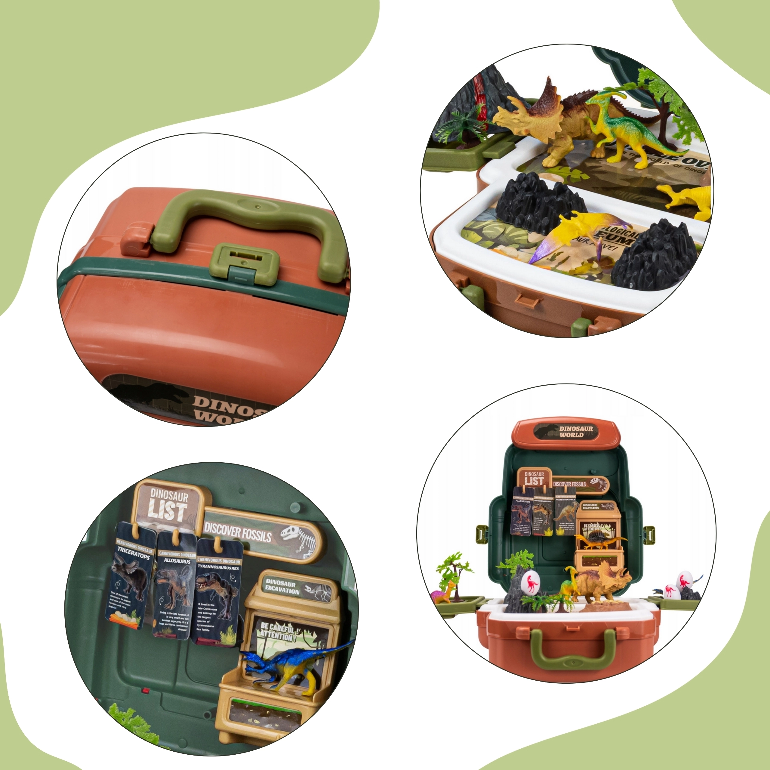 Suitcase with interior scene, multiple dinosaur figures, volcano, rocks, nest and eggs, trees and plants, small tools/accessories, educational cards