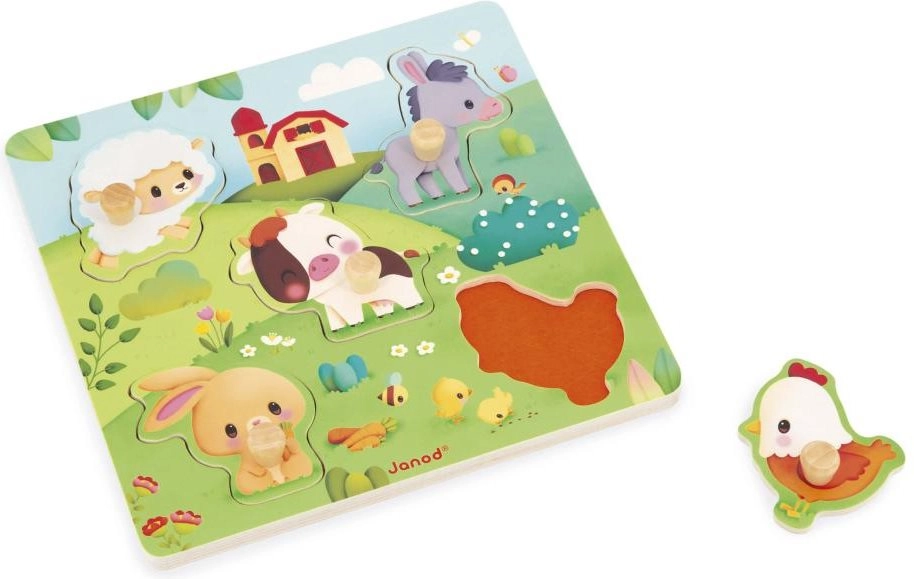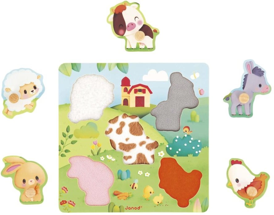 Discover playful learning with the JANOD wooden puzzle that offers kids a tactile experience thanks to samples of animal fur and skin. It supports the development of fine motor skills, logical thinking, and shape recognition in one fun product with practical knobs for easy handling.