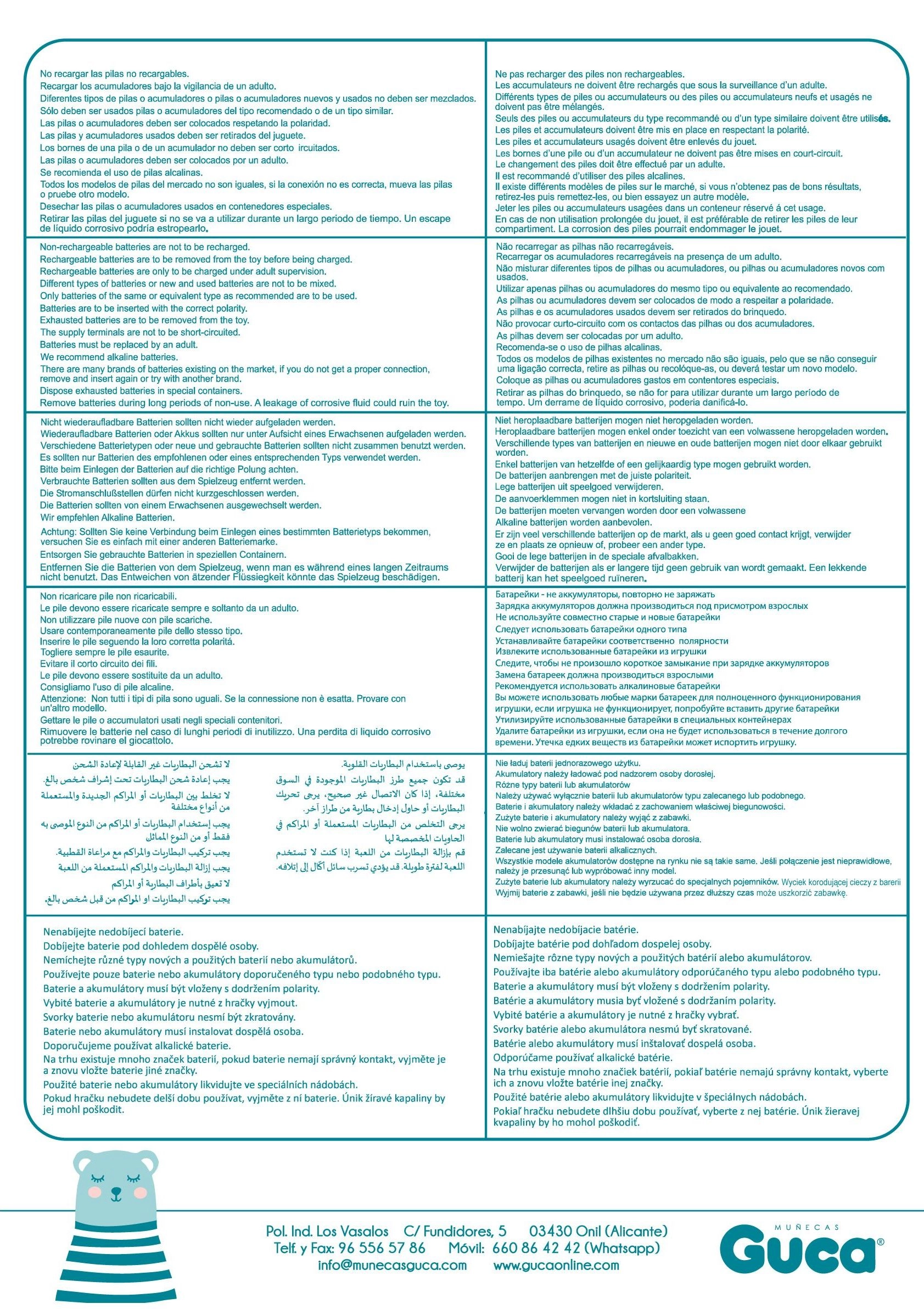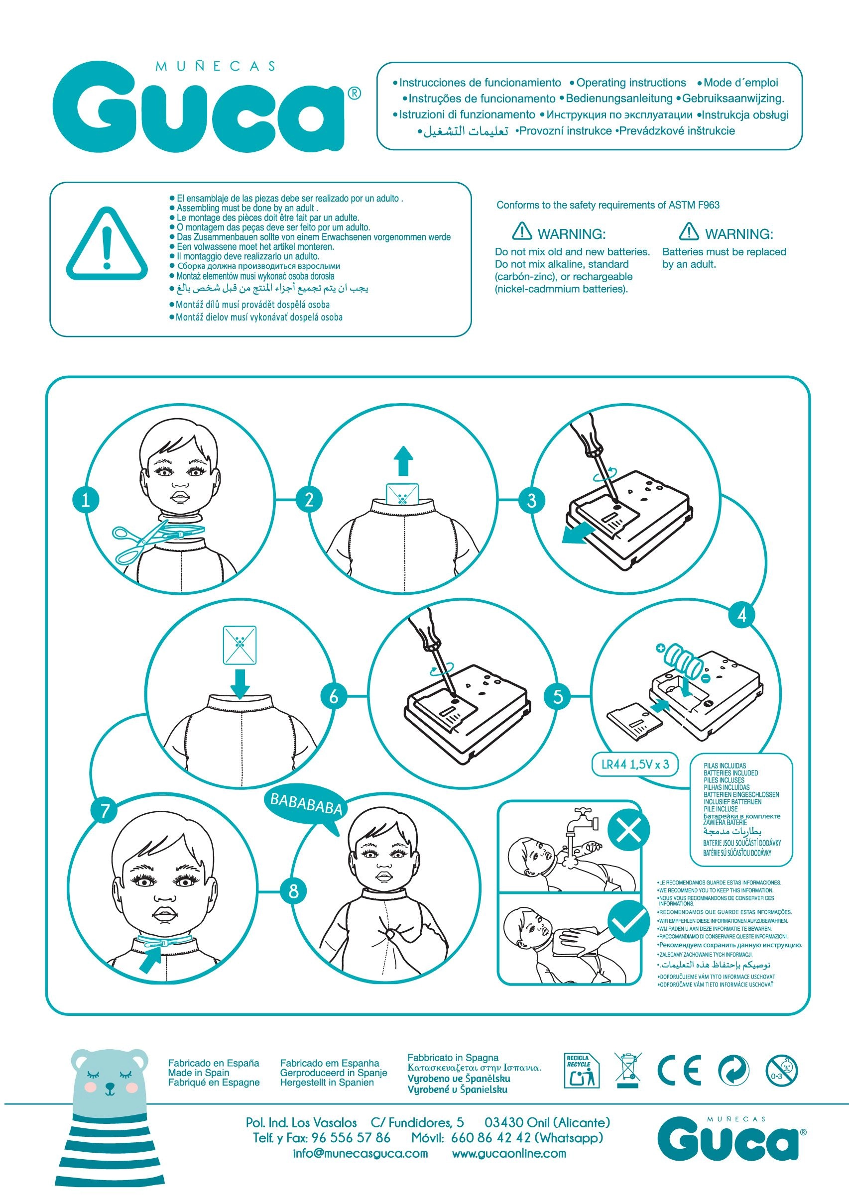 The doll is handmade in Spain with attention to detail and quality. It comes in a gift box, making it an ideal present. The package also includes 3 LR44 button batteries and instructions for their replacement.