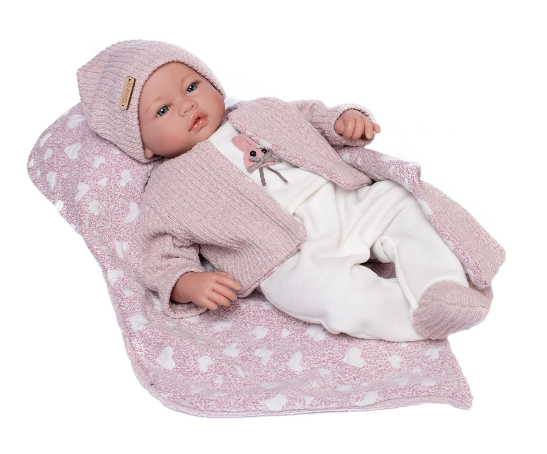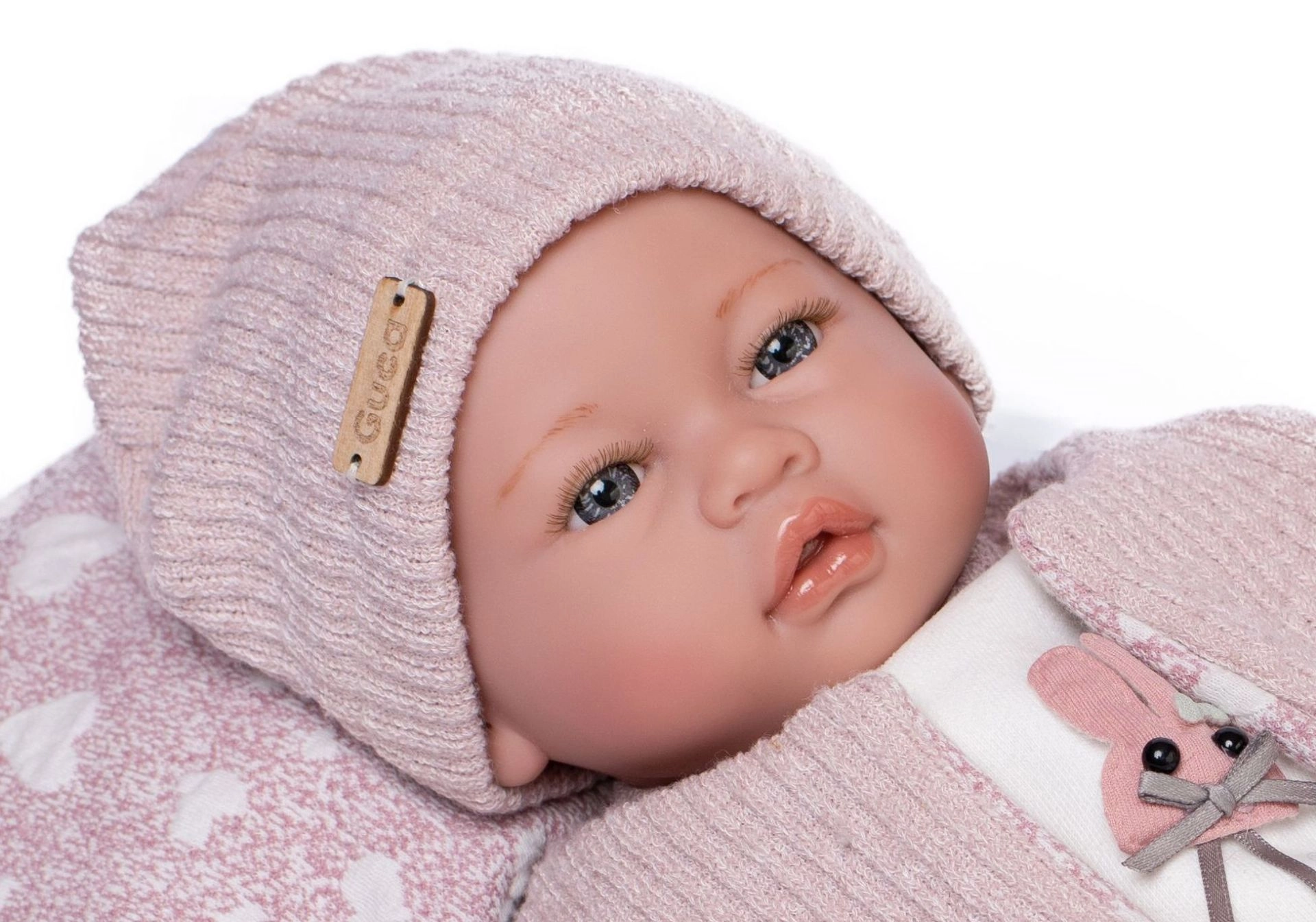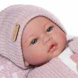 Adorable realistic baby doll with a soft cloth body and laughing sound when the chest is pressed will delight every child. Thanks to jointed, poseable limbs, it can also sit. Size 46 cm, handmade in Spain, elegant gift packaging. Suitable from 3 years.