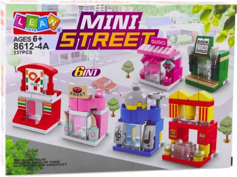 Discover the creative Mini Street 6-in-1 building set with 137 pieces, from which kids can build colorful buildings like a shop, café, bookstore, restaurant, pastry shop, or a music hall. The set supports fine motor skills, logical thinking, and creativity, is compatible with popular bricks on the market, and comes in gift packaging.