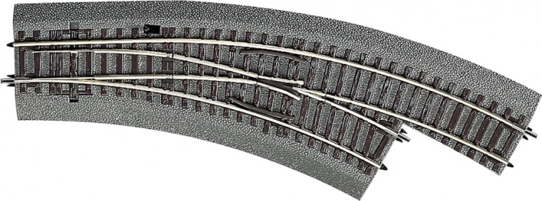 ROCO LINE curved turnout with realistic reproduction of wooden sleepers on a gravel roadbed for H0 scale model railways. Combines two curves R3 (419.6 mm) and R2 (358 mm) at an angle of 30° to the right. Offers a solid and durable construction, the option of manual and remote control via switch motors, and excellent electrical conductivity thanks to a zinc-silver alloy.