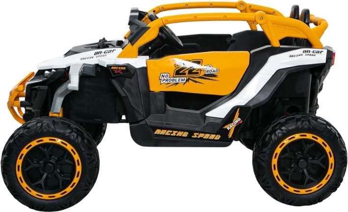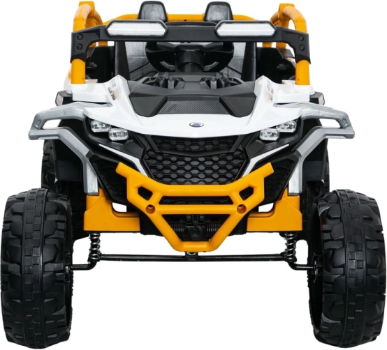 A stylish kids’ electric car in yellow and white delivers a realistic off-road driving experience. Thanks to the 4x4 drive, wide off-road wheels, and robust construction, it’s ideal for outdoor play. LED lights, a steering wheel with simple controls, and two seats ensure a safe and fun ride for young drivers.