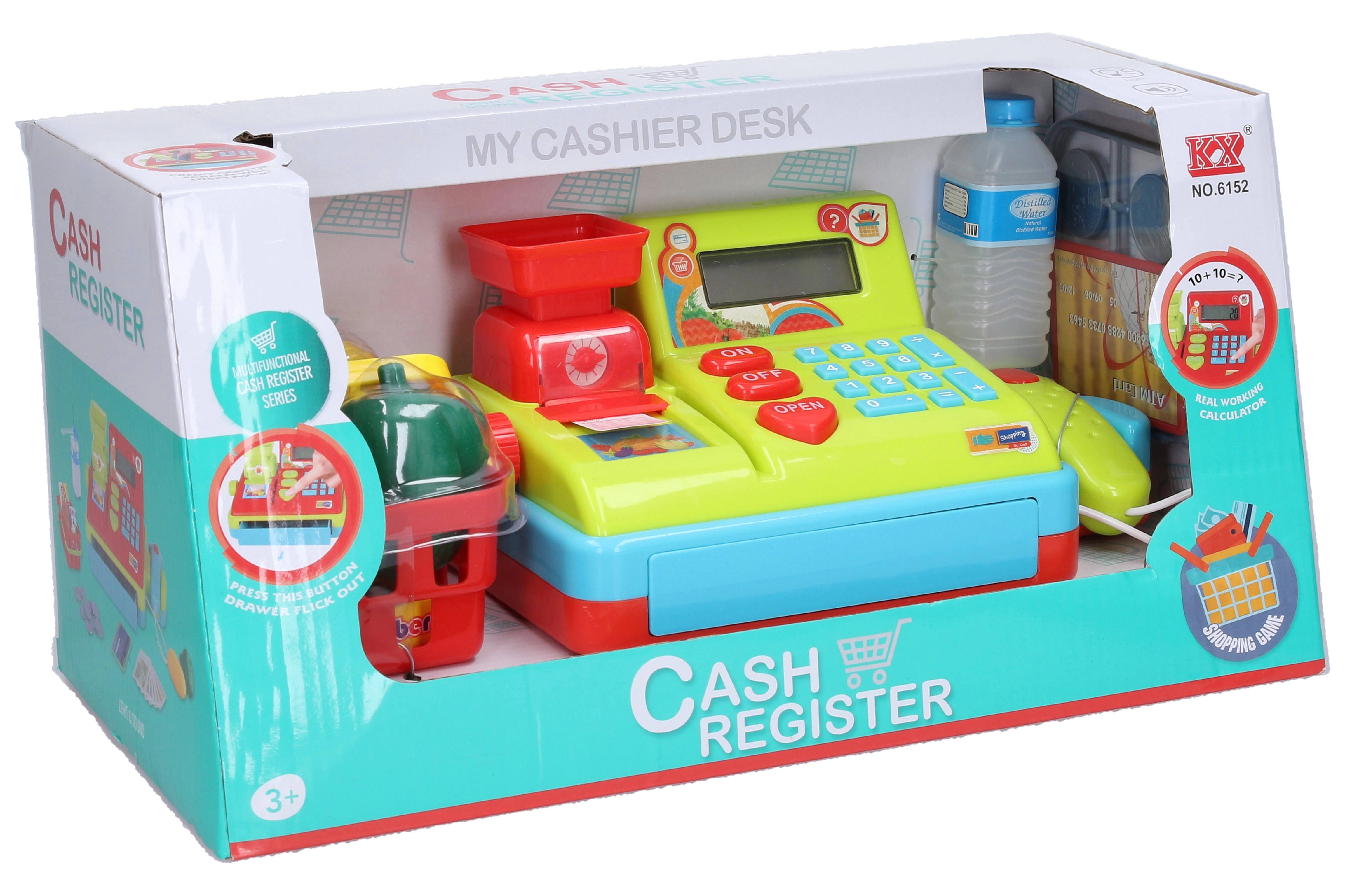 - Register with scale, paper receipt, sliding drawer, play money, payment card, shopping basket with groceries