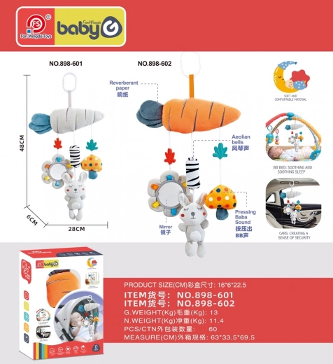 A sensory hanging toy for a stroller, crib, or car seat, suitable from the very first days of life. Made from soft and safe materials, it features crinkly and squeaky elements, wind chimes, and a safe mirror. Vivid colors support focus, grasping, and the development of your baby’s senses.