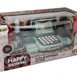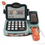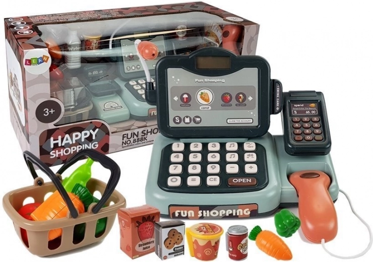 The handheld scanner recognizes barcodes and identifies prices. The “=” button announces the amount due and prompts payment in cash or by card—just like in a real store.