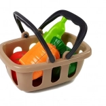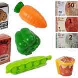 The box includes everything you need: a cash register with scale and card reader, handheld scanner, basket, play food (cookies, juice, water, ice cream, cola, vegetables), payment card, banknotes, and 6 plastic coins. The play is highly realistic and develops imagination and fine motor skills.