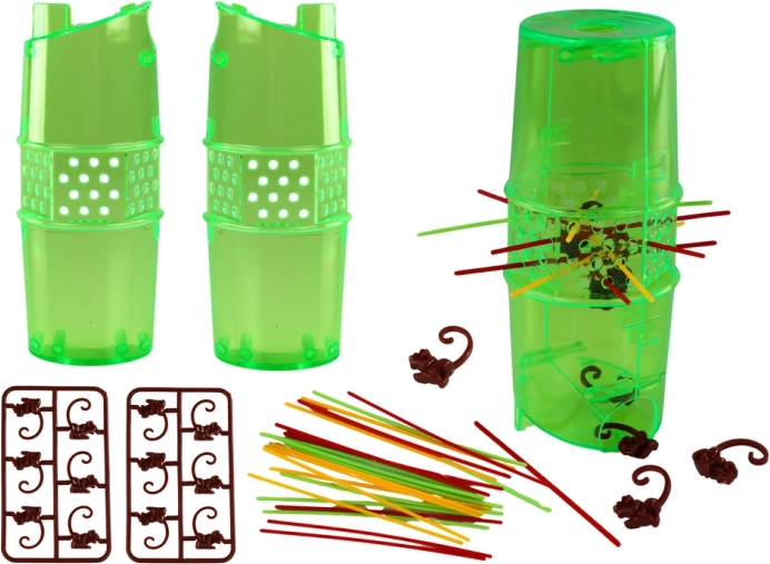 Dexterity game Catch the Monkey: tower, 21 sticks, and 12 monkeys. Simple rules, lots of fun, develops motor skills. CE, EN71 certified. For children from 3 years.