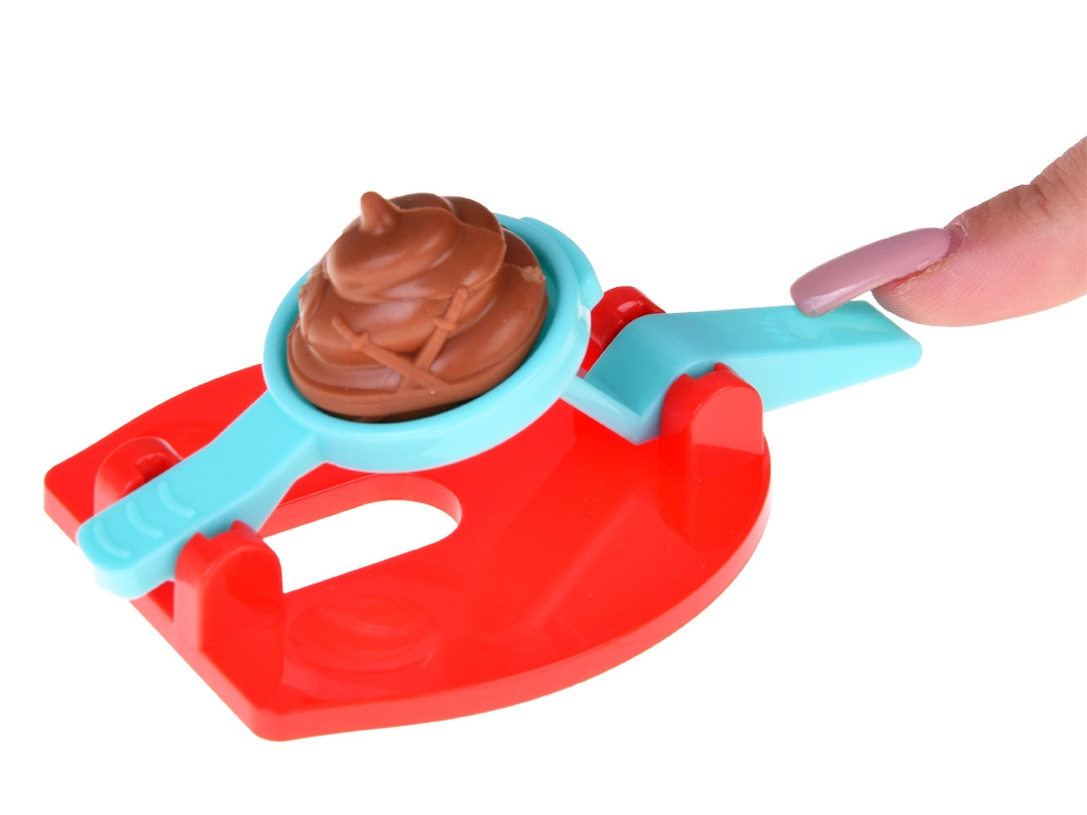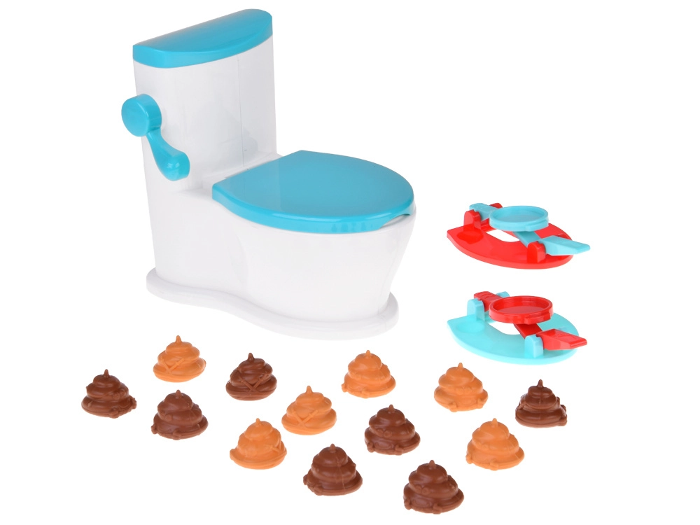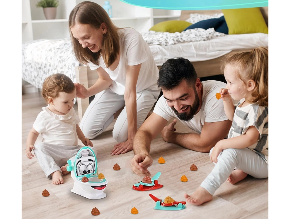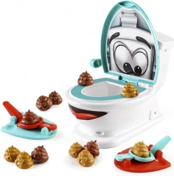 A toilet with a funny face, launchers, and piles of “poops” in two colors promise simple rules and tons of fun. Each player has their own set and simultaneously aims for the bowl—whoever closes the lid first wins the title Flush Master.