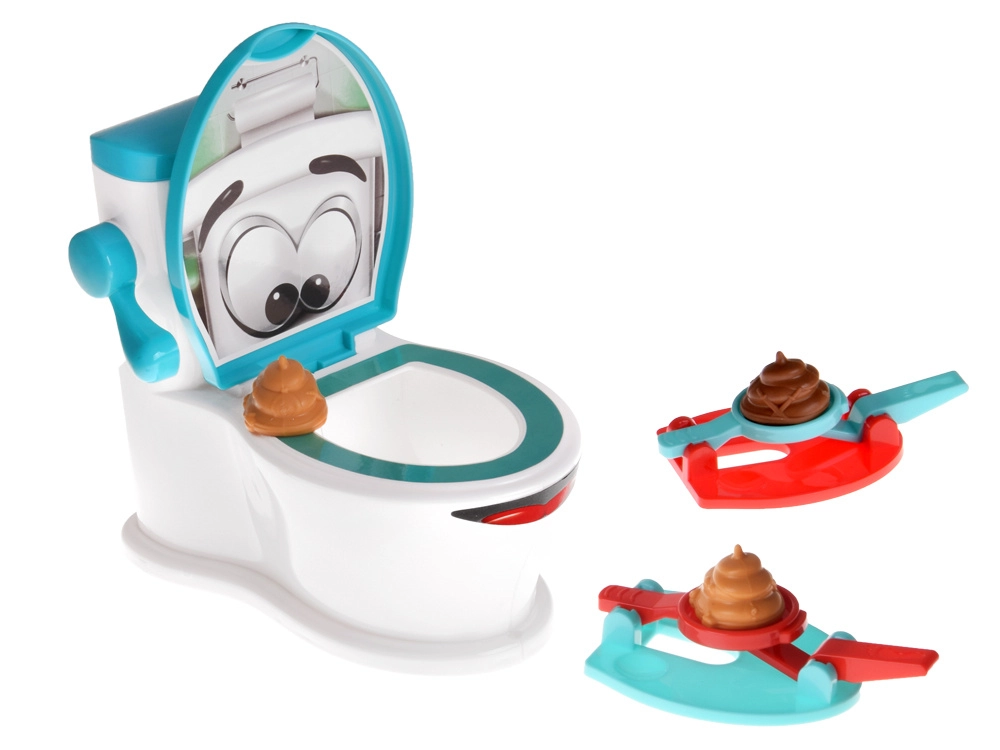- Game toilet with lid and lever, 2× launcher, 12× game piece in two colors