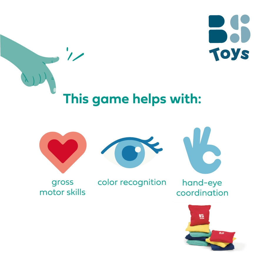 Discover versatile fun for kids and adults: a set of 8 colorful fabric sandbags offering up to 6 game variants. Ideal for 1–8 players aged 3+, with games easily adapted to age and space. Supports gross motor skills, hand–eye coordination, and color recognition.