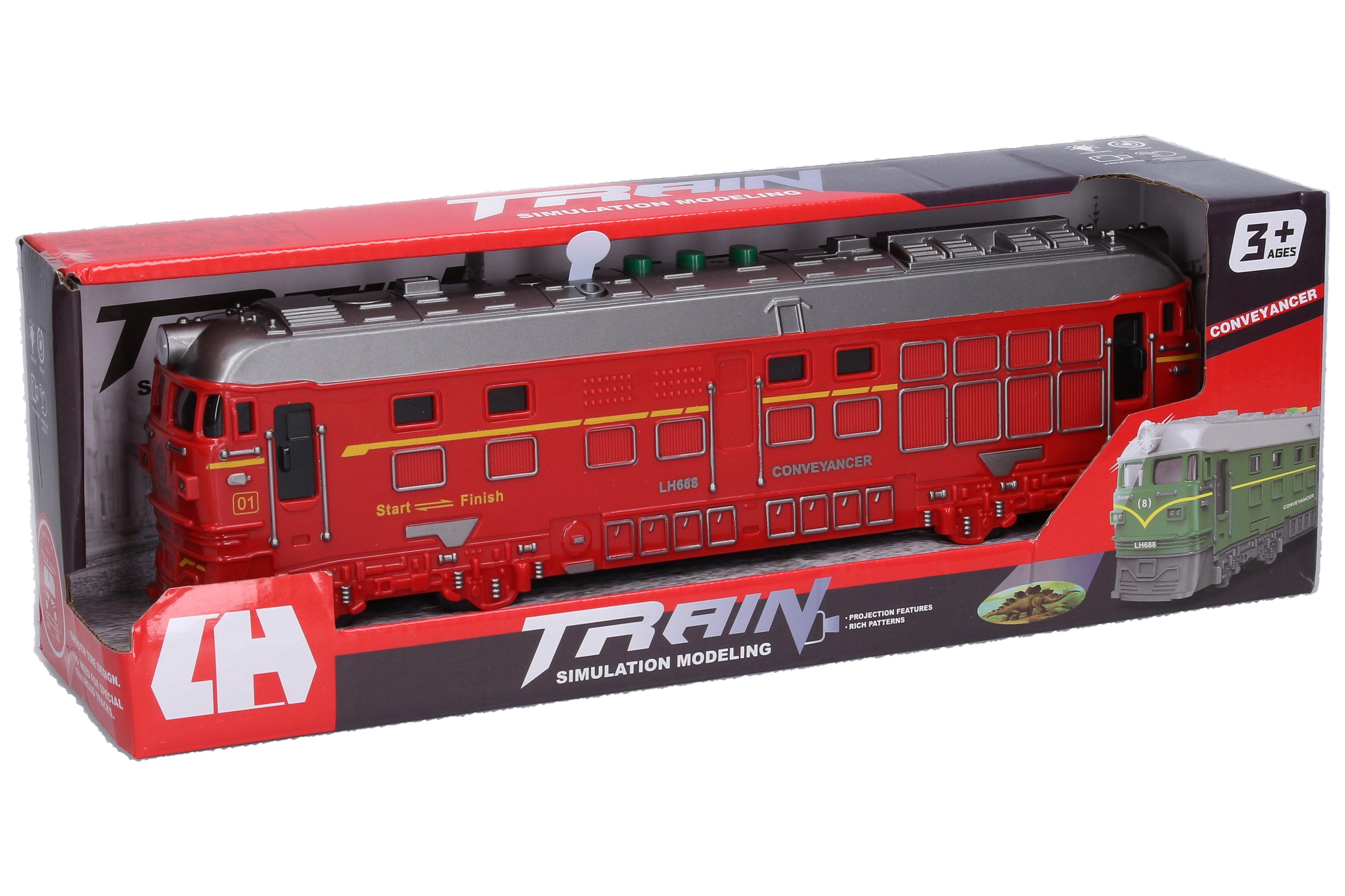A fun and durable red friction-powered train will delight young railway fans. It features light and sound effects, impressive projection, and easy button controls on the roof. Batteries are included, so it's ready to play right out of the box.