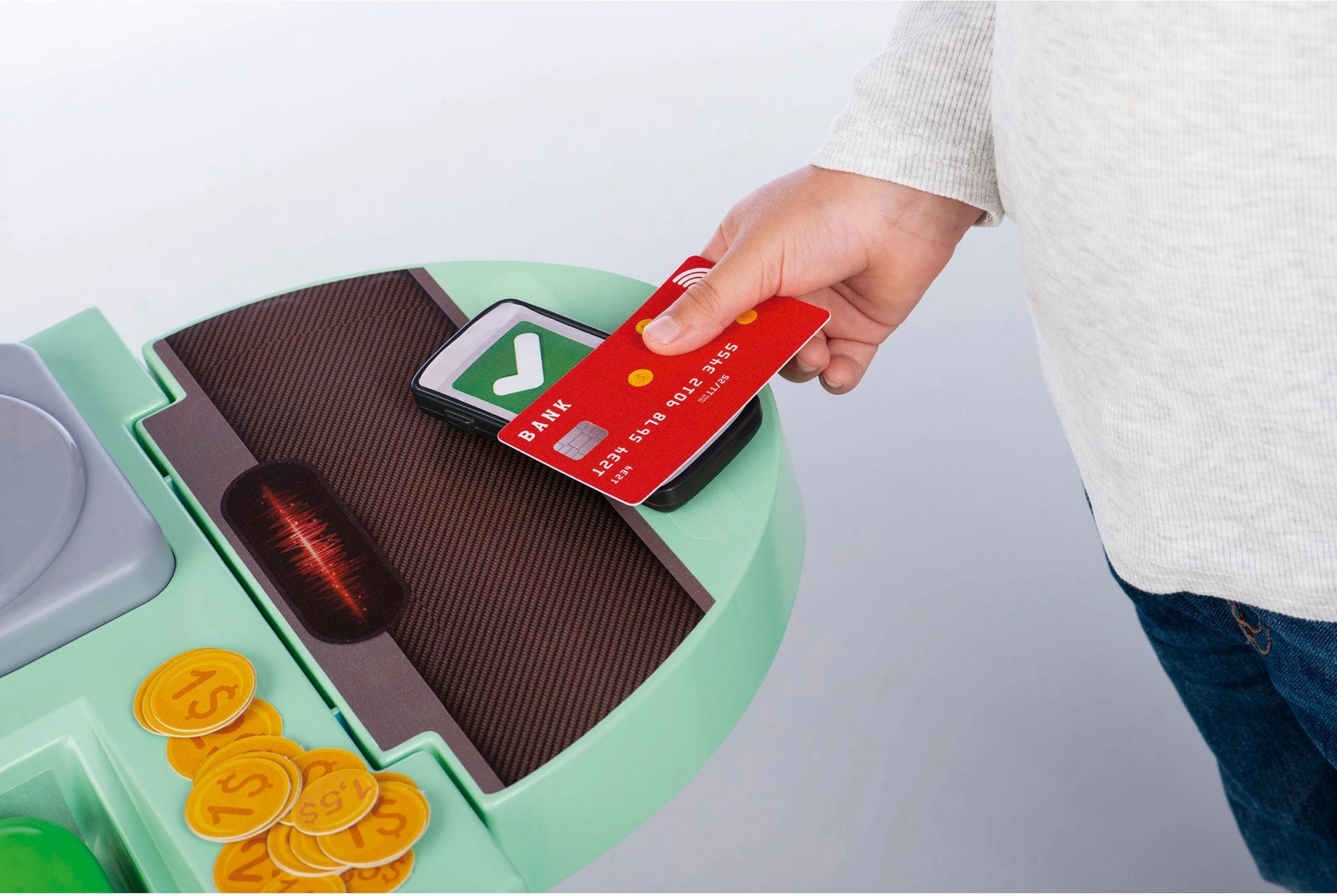 The scanner, payment terminal, and clear shelves with price tags let kids enjoy a true supermarket atmosphere.