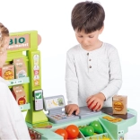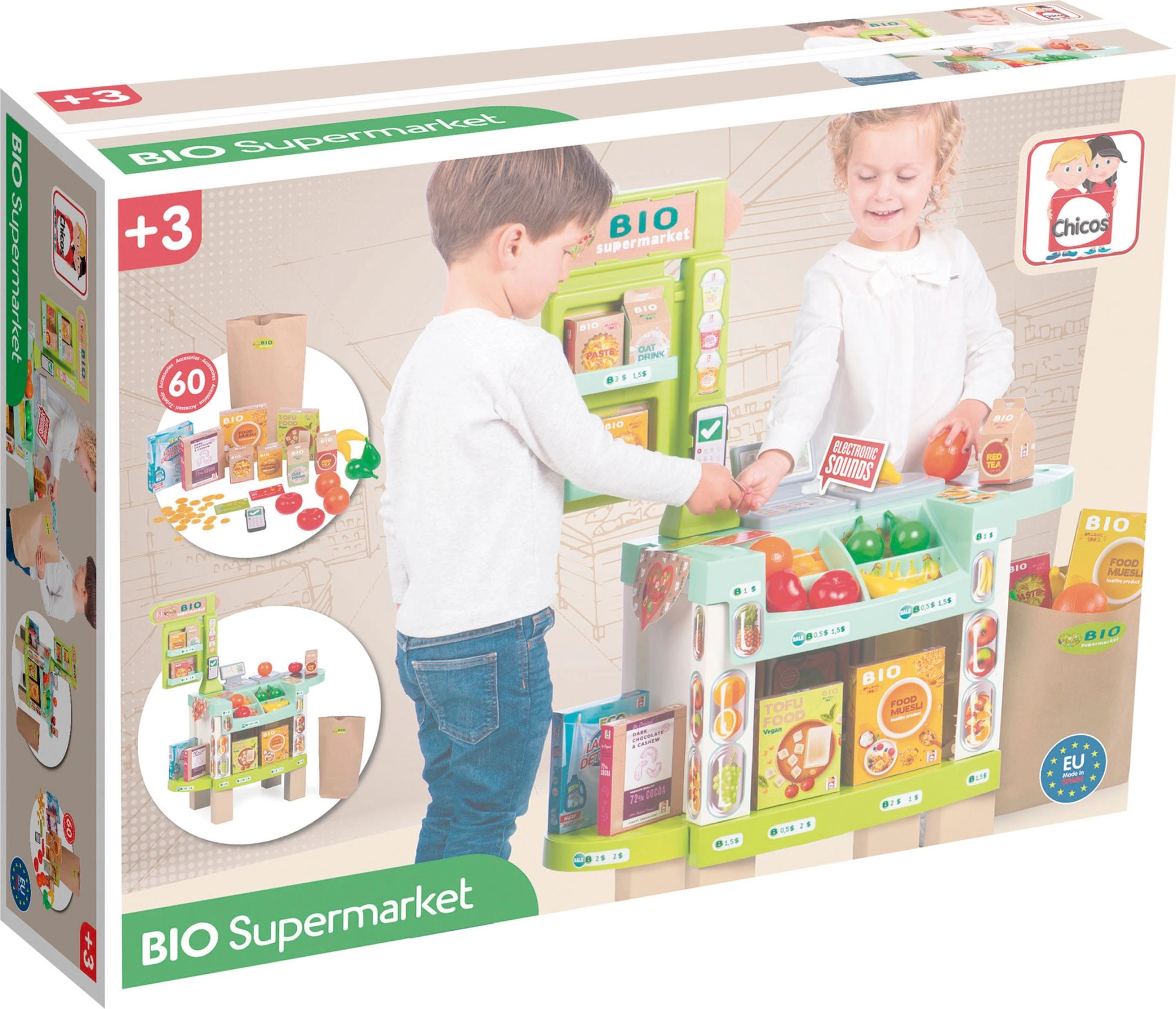 The CHICOS Kids’ BIO Supermarket turns a room into a mini store where children can try the roles of cashier and customer. The generous set of 60 accessories, including fruit, food boxes, a scanner, and a payment terminal, supports role-play and develops communication, fine motor skills, and logical thinking.