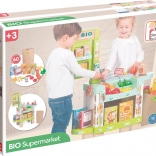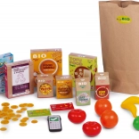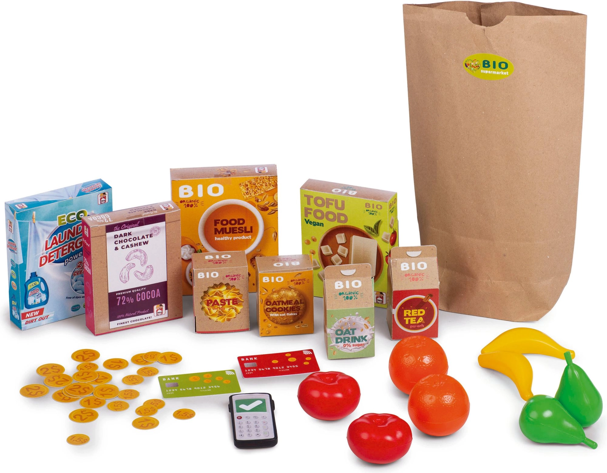 Fruit, food boxes, coins, a phone, and a large BIO shopping bag—everything for complete shopping play.