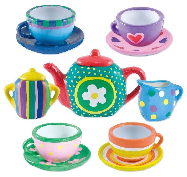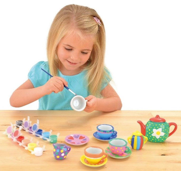 Turn an ordinary afternoon into colorful crafting. The GALT set includes a complete miniature ceramic tea set that kids can decorate themselves – from dots to stripes. Once dry, the painted set becomes a lovely prop for pretend parties.