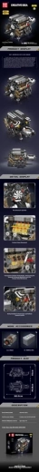 • Realistic features: valve train, moving pistons, crankshaft, twin turbochargers, exhaust manifold