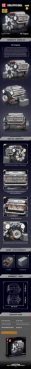 The model is equipped with an electric L motor and a power box for 6× AAA 1.5 V batteries (not included). Once assembled, the moving parts come to life — the valvetrain, precise piston motion, turbocharger, and exhaust — giving you an engaging demonstration of how a real engine works.